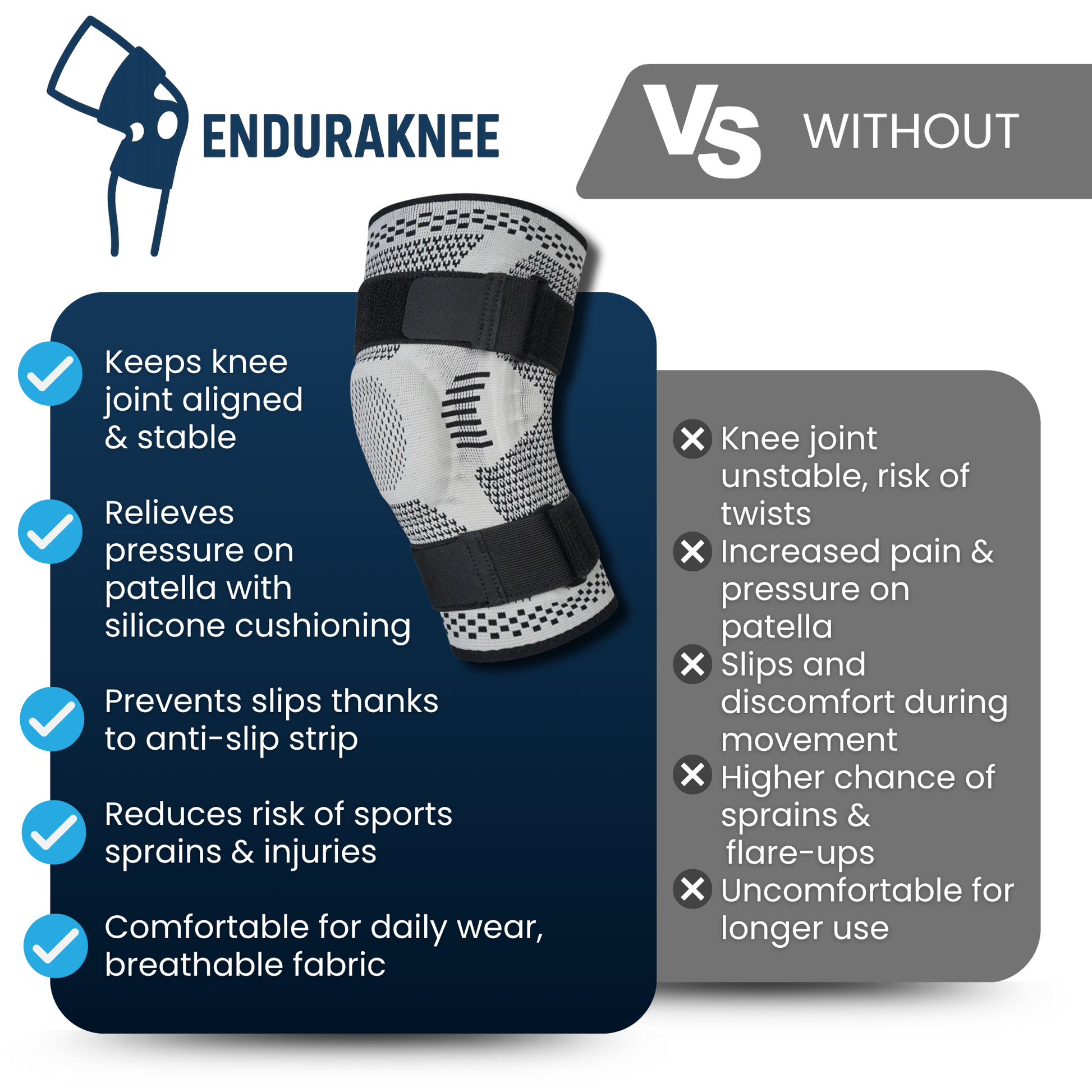 Many braces are bulky or slip down making them frustrating to use. EnduraKnee™ combines a breathable knit fabric with anti-slip grips, ensuring it stays in place and feels comfortable enough for all-day wear under clothing.